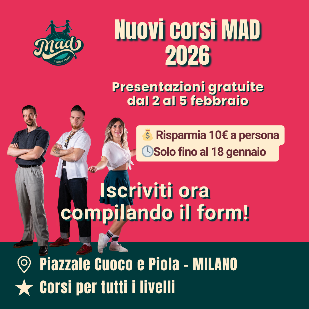ISCRIZIONE NUOVI CORSI SWING MAD Promo Nuovi Corsi – Stagione 2025/2026 ⭐ MILANO ⭐ ✨ NUOVI CORSI SWING BASE 2026 in Piazzale CUOCO ✨[…]